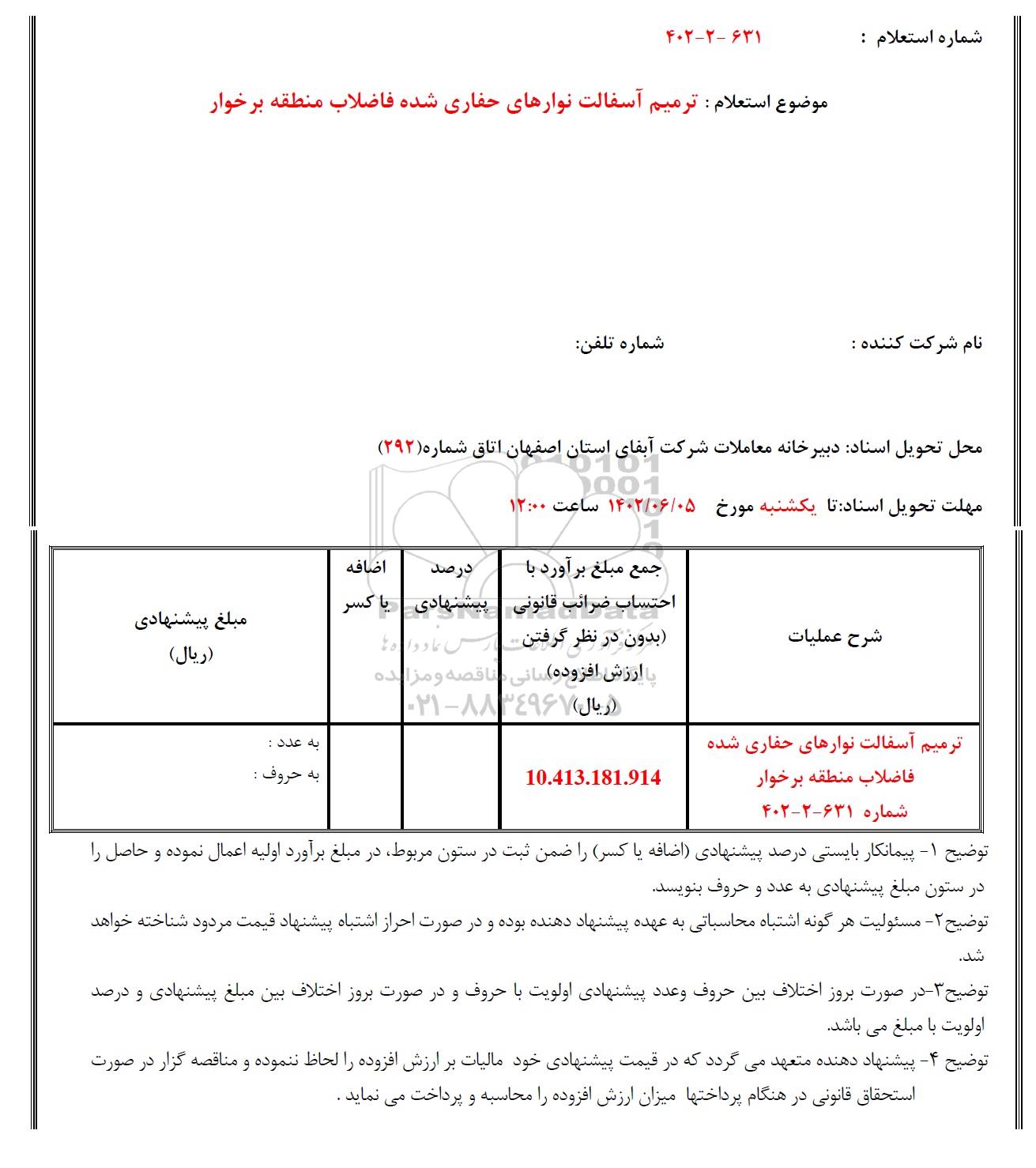 موضوع استعلام: ترمیم آسفالت نوارهای حفاری شده فاضلاب منطقه برخوار