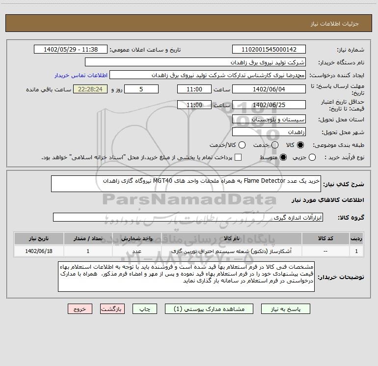 شرح کلی نیاز: خرید یک عدد Flame Detector به همراه ملحقات واحد های MGT40 نیروگاه گازی زاهدان