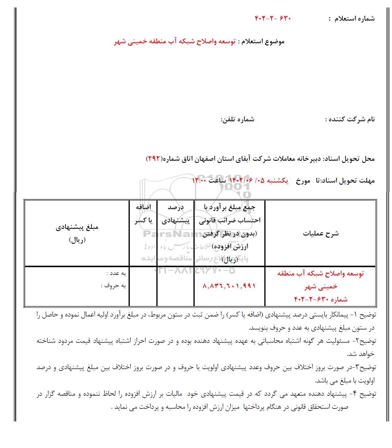 محل تحویل اسناد: دبیرخانه معاملات شرکت آبفای استان اصفهان اتاق شماره (292)