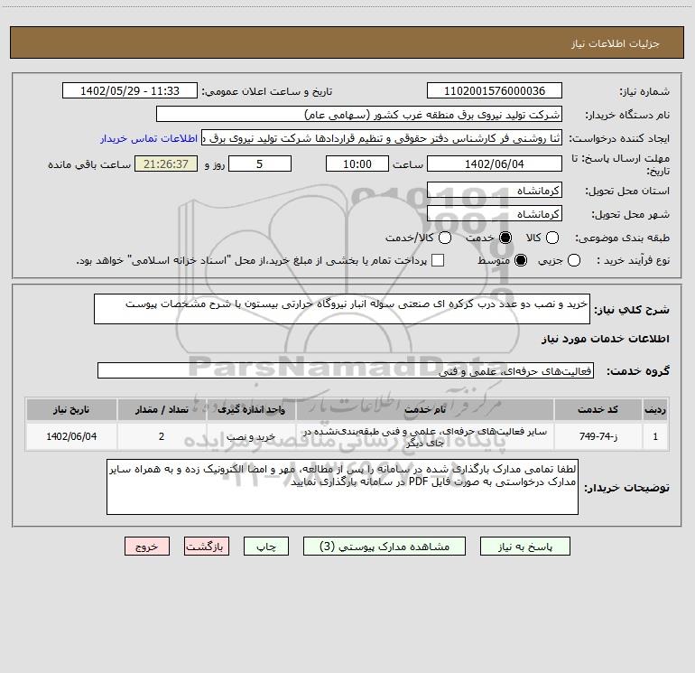 شرح کلی نیاز: خرید و نصب دو عدد درب کرکره ای صنعتی سوله انبار نیروگاه حرارتی بیستون با شرح مشخصات پیوست