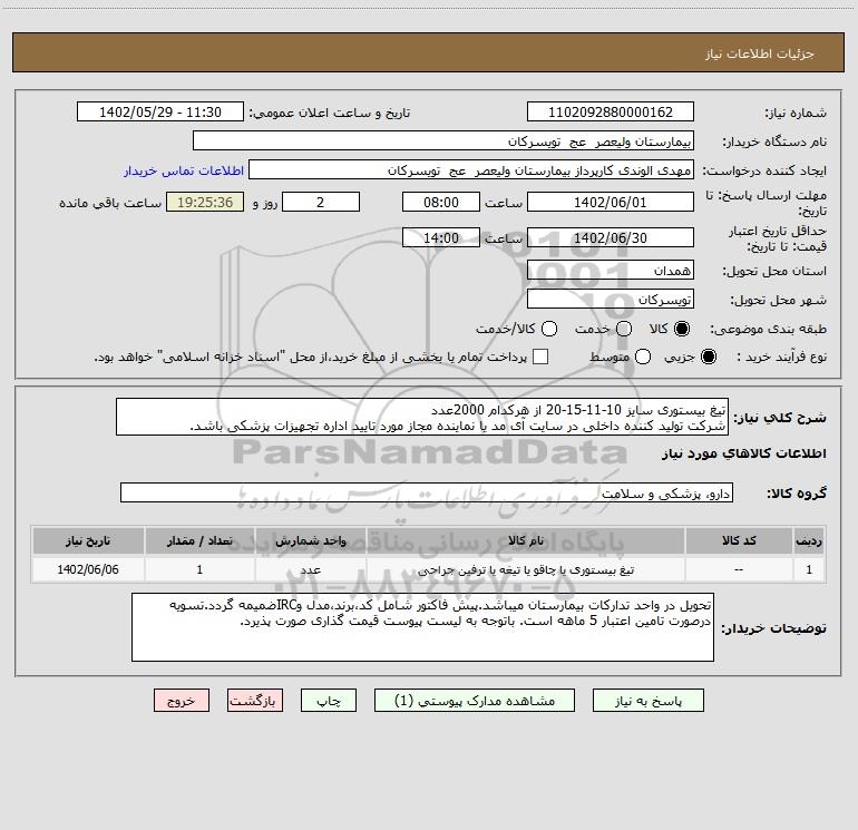 شرح کلی نیاز: تیغ بیستوری سایز 10-11-15-20 از هرکدام 2000عدد