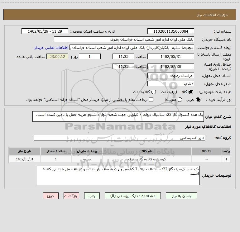 شرح کلی نیاز: یک عدد کپسول گاز r22 سانتیال دیوای 7 کیلویی جهت شعبه بلوار دانشجو.هزینه حمل با تامین کننده است.