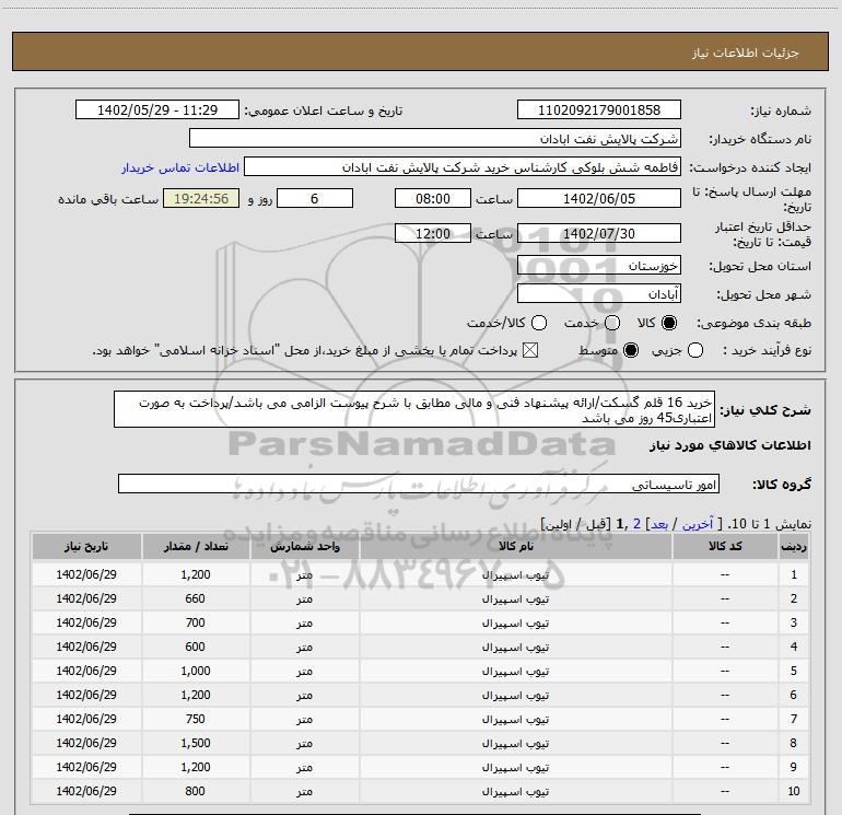 شرح کلی نیاز: خرید 16 قلم گسکت/ارائه پیشنهاد فنی و مالی مطابق با شرح پیوست الزامی می باشد/پرداخت به صورت اعتباری45 روز می باشد
