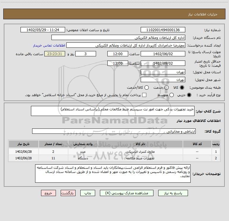 شرح کلی نیاز: خرید تجهیزات یدکی جهت امور نت سیستم ضبط مکالمات محلی(براساس اسناد استعلام)