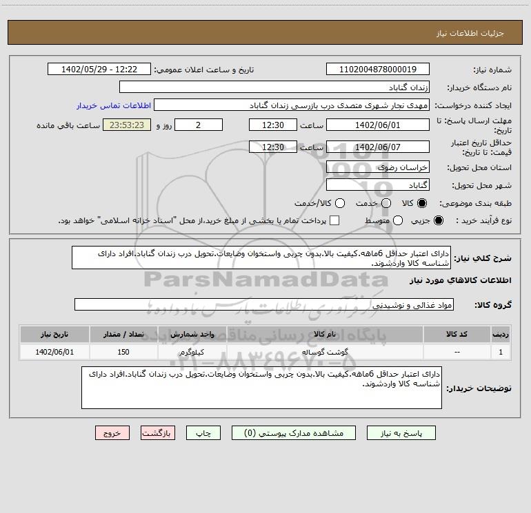 شرح کلی نیاز: دارای اعتبار حداقل 6ماهه.کیفیت بالا.بدون چربی واستخوان وضایعات.تحویل درب زندان گناباد.افراد دارای شناسه کالا واردشوند.