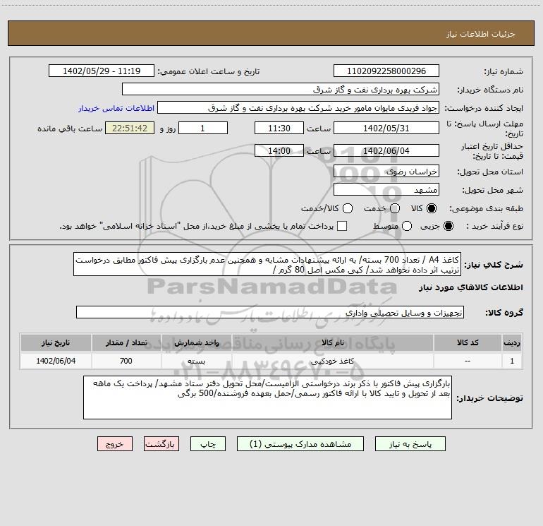 نام دستگاه خریدار:شرکت بهره برداری نفت و گاز شرق