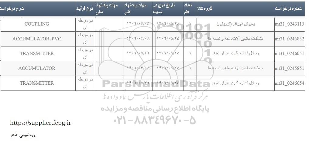 | شماره درخواست | گروه کالا | تعداد قلم | مهلت پیشنهاد فنی | نوع فرآیند | شرح درخواست |