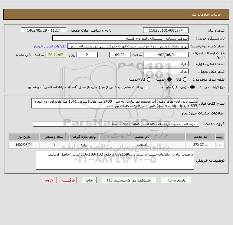 شرح کلی نیاز: نشت یابی لوله های دفنی آب مجتمع تهرانپارس به متراژ 2400 متر طول (شامل 1541 متر طول لوله دو اینچ و 859 مترطول لوله سه اینچ) طبق شرایط ومشخصات پیوست.