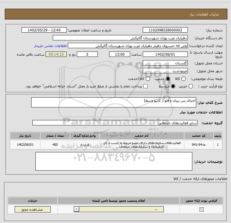 شرح کلی نیاز: اجرای بتن ریزی و قنو ( کانیو وسط)