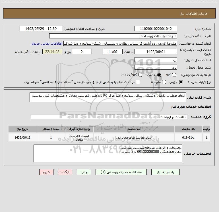 شرح کلی نیاز: انجام عملیات تکمیل روشنائی سالن سوئیچ و دیتا مرکز PC یزد طبق فهرست مقادیر و مشخصات فنی پیوست