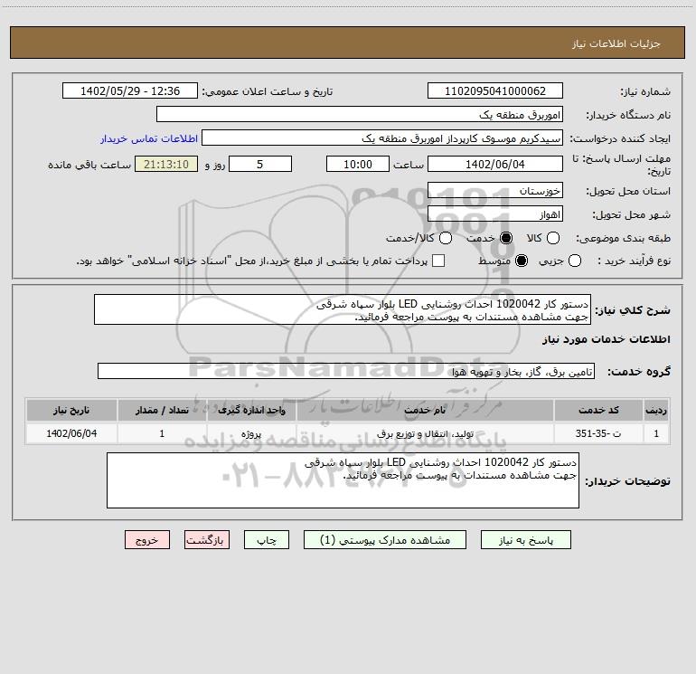 شرح کلی نیاز: دستور کار 1020042 احداث روشنایی LED بلوار سپاه شرقی جهت مشاهده مستندات به پیوست مراجعه فرمائید.