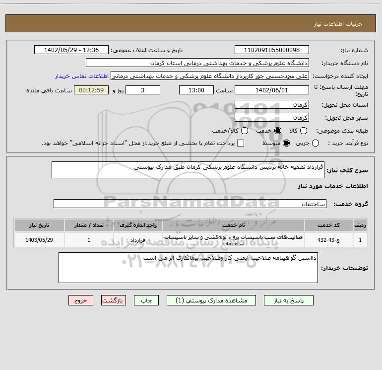 شرح کلی نیاز: قرارداد تصفیه خانه پردیس دانشگاه علوم پزشکی کرمان طبق مدارک پیوستی
