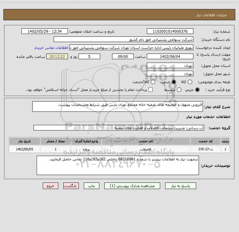 شرح کلی نیاز: لایروبی منهول و حوضچه های تصفیه خانه مجتمع تهران پارس طبق شرایط ومشخصات پیوست.