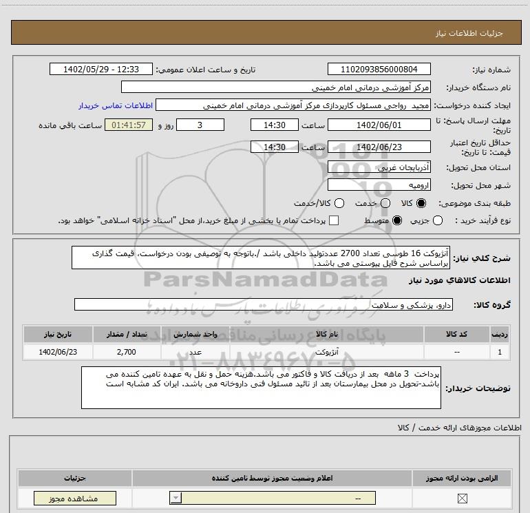 شرح کلی نیاز: آنژیوکت 16 طوسی تعداد 2700 عددتولید داخلی باشد /.باتوجه به توصیفی بودن درخواست، قیمت گذاری براساس شرح فایل پیوستی می باشد.