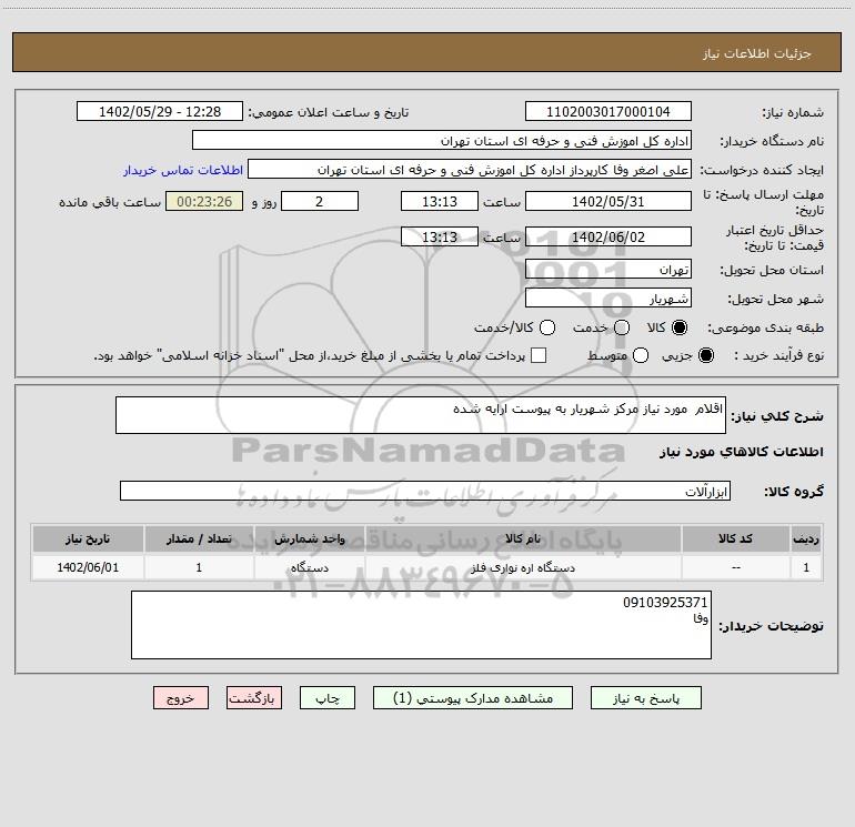 شرح کلی نیاز: اقلام مورد نیاز مرکز شهریار به پیوست ارایه شده