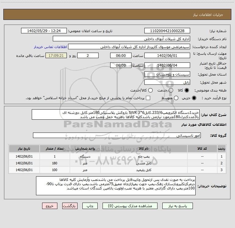شرح کلی نیاز: خرید1دستگاه الکتروپمپ233/6،کابل6*3 SWR باروکش پلاستیکی180متر،کابل دورشته ای با3عددکنترل180مترمورد نیازمی باشدکلیه کالاها باهزینه حمل ونصب می باشد