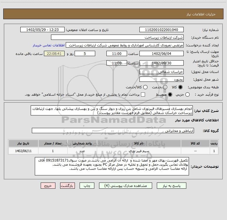 شرح کلی نیاز: انجام بهسازی مسیرهای فیبرنوری شامل بتن ریزی و دیوار سنگ و بتن و بهسازی پیشانی پلها، جهت ارتباطات زیرساخت خراسان شمالی (مطابق فرم فهرست مقادیر پیوست.)