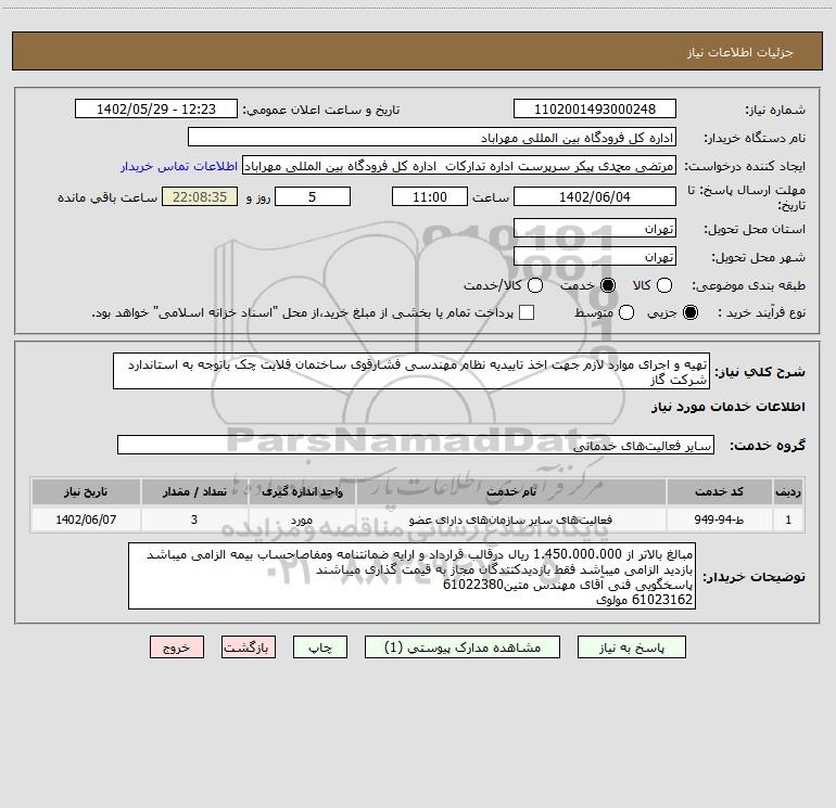 شرح کلی نیاز: تهیه و اجرای موارد لازم جهت اخذ تاییدیه نظام مهندسی فشارقوی ساختمان فلایت چک باتوجه به استاندارد شرکت گاز