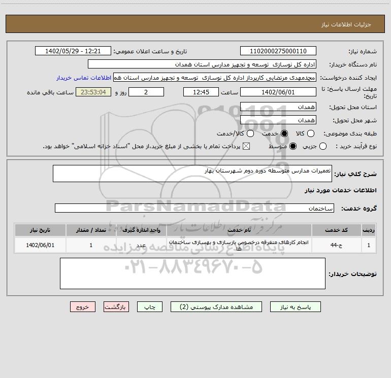 شرح کلی نیاز: تعمیرات مدارس متوسطه دوره دوم شهرستان بهار