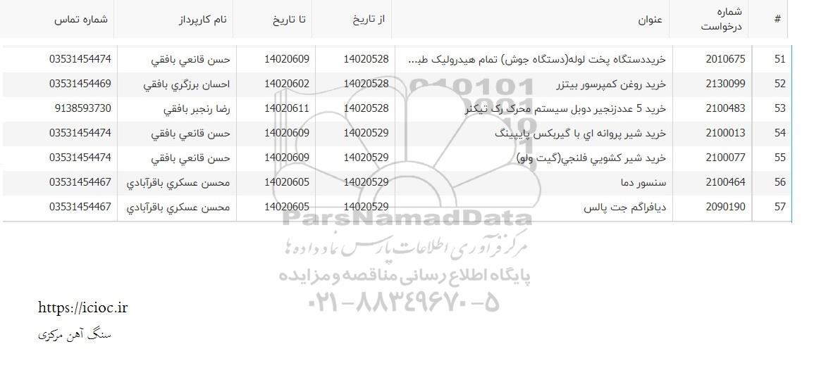 | 2100077 | خرید شیر کشویی فلنجی (گیت ولو) | 1402.6.9 | حسن قانعی بافقی | 03531454474 |