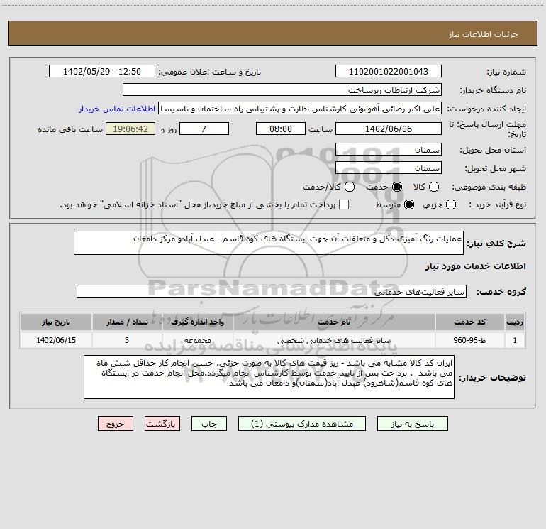 شرح کلی نیاز: عملیات رنگ آمیزی دکل و متعلقات آن جهت ایستگاه های کوه قاسم - عبدل آبادو مرکز دامغان