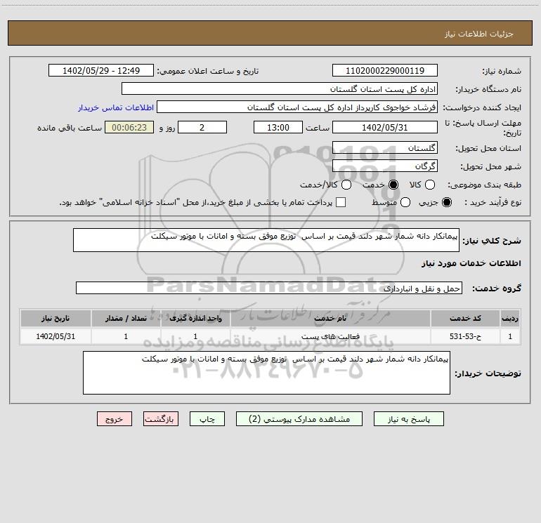 شرح کلی نیاز: پیمانکار دانه شمار شهر دلند قیمت بر اساس توزیع موفق بسته و امانات با موتور سیکلت