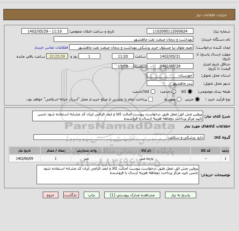 شرح کلی نیاز: پرولین مش اتق عمل طبق درخواست پیوست اصالت کالا و ایمد الزامی ایران کد مشابه استفاده شود جنس تایید مرکز پرداخت دوماهه هزینه ارسال با فروشنده