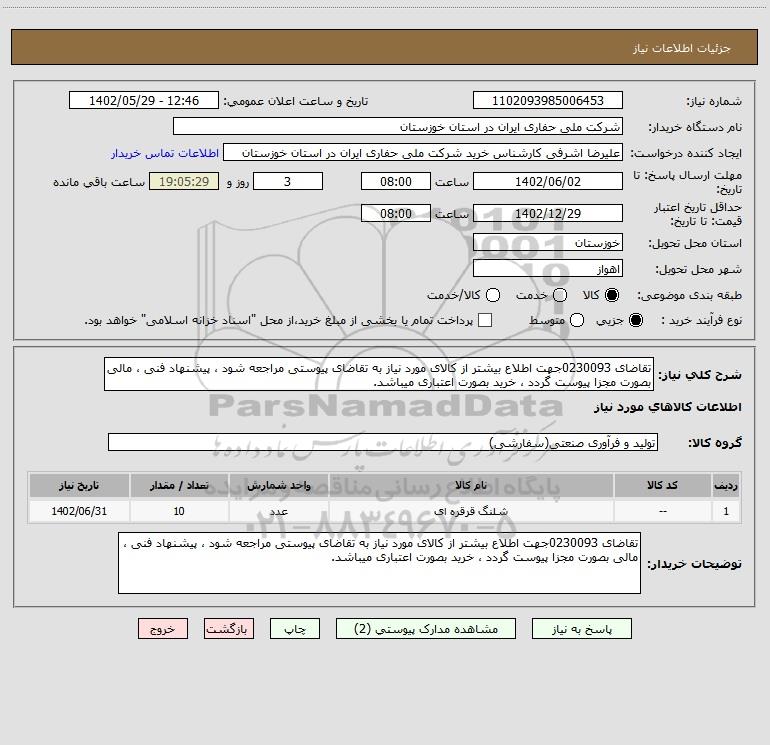 توضیحات خریدار:تقاضای 0230093جهت اطلاع بیشتر از کالای مورد نیاز به تقاضای پیوستی مراجعه شود ، پیشنهاد فنی ، مالی بصورت مجزا پیوست گردد ، خرید بصورت اعتباری میباشد.