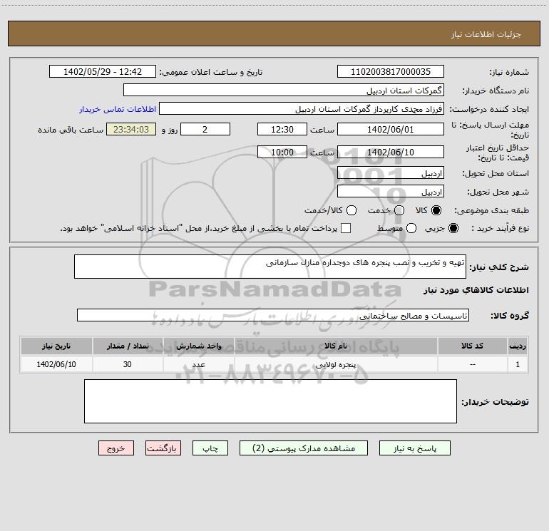 شرح کلی نیاز: تهیه و تخریب و نصب پنجره های دوجداره منازل سازمانی
