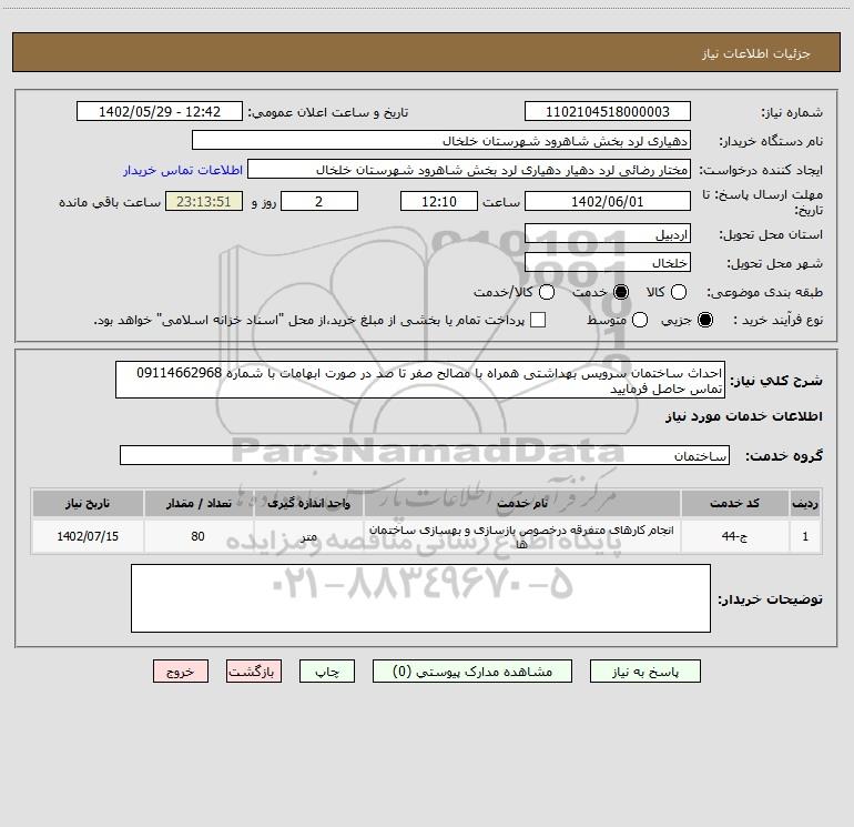 شرح کلی نیاز: احداث ساختمان سرویس بهداشتی همراه با مصالح صفر تا صد در صورت ابهامات با شماره 09114662968 تماس حاصل فرمایید