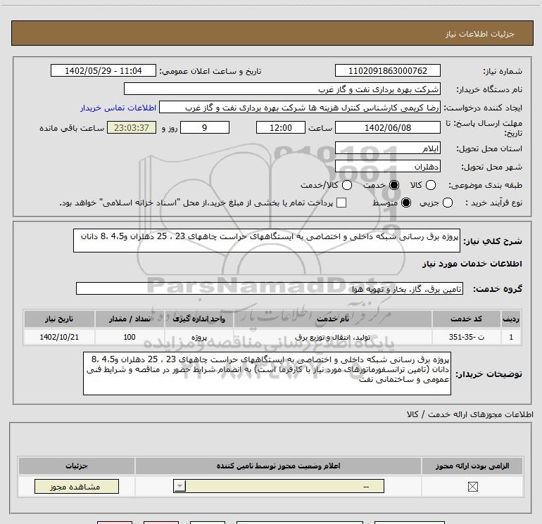 شرح کلی نیاز: پروژه برق رسانی شبکه داخلی و اختصاصی به ایستگاههای حراست چاههای 23 ، 25 دهلران و4،5 ،8 دانان