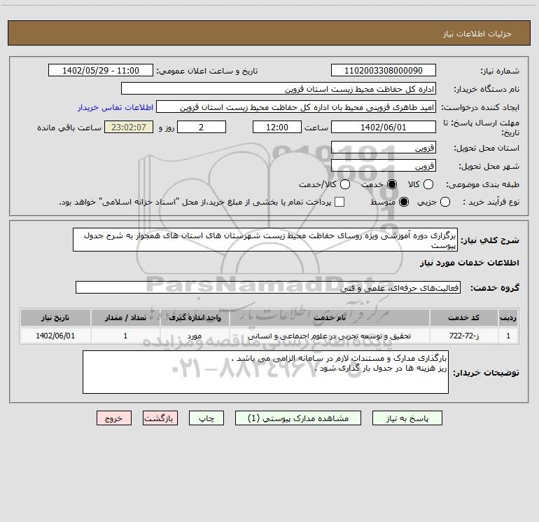 شرح کلی نیاز: برگزاری دوره آموزشی ویژه روسای حفاظت محیط زیست شهرستان های استان های همجوار به شرح جدول پیوست