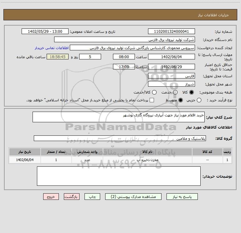 شرح کلی نیاز: خربد اقلام مورد نیاز جهت آبیاری نیروگاه گازی بوشهر