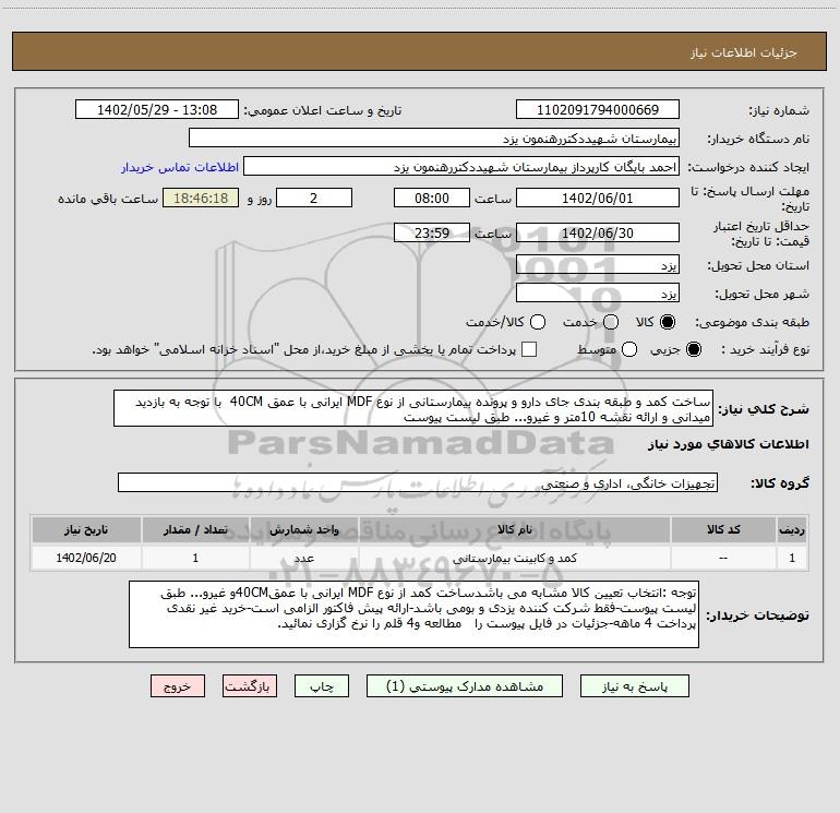 شرح کلی نیاز: ساخت کمد و طبقه بندی جای دارو و پرونده بیمارستانی از نوع MDF ایرانی با عمق 40CM با توجه به بازدید میدانی و ارائه نقشه 10متر و غیرو... طبق لیست پیوست