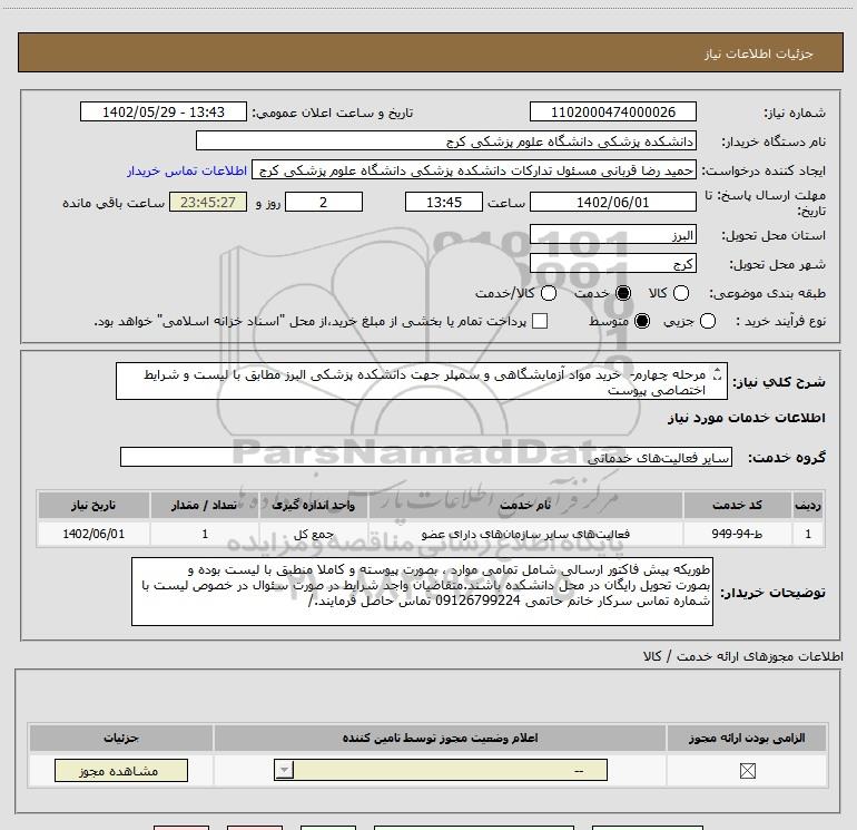 شرح کلی نیاز: مرحله چهارم- خرید مواد آزمایشگاهی و سمپلر جهت دانشکده پزشکی البرز مطابق با لیست و شرایط اختصاصی پیوست