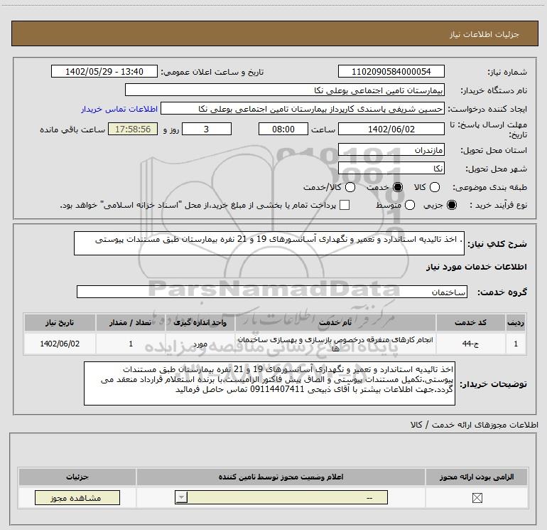 شرح کلی نیاز: . اخذ تائیدیه استاندارد و تعمیر و نگهداری آسانسورهای 19 و 21 نفره بیمارستان طبق مستندات پیوستی