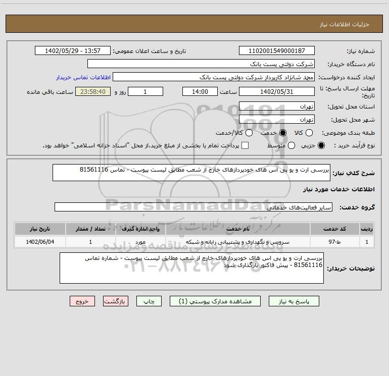 شرح کلی نیاز: بررسی ارت و یو پی اس های خودپردازهای خارج از شعب مطابق لیست پیوست - تماس 81561116