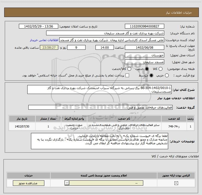 استعلام 86-314-1402/0010-1 برق رسانی به شیرگاه سبزآب اندیمشک شرکت بهره برداری نفت و گاز مسجدسلیمان ؟