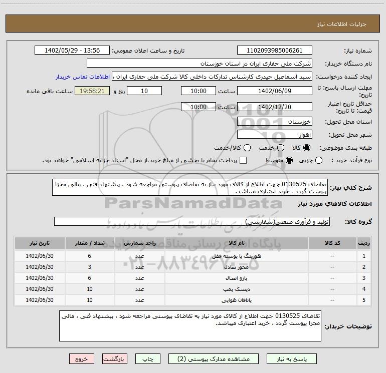 توضیحات خریدار:تقاضای 0130525 جهت اطلاع از کالای مورد نیاز به تقاضای پیوستی مراجعه شود ، پیشنهاد فنی ، مالی مجزا پیوست گردد ، خرید اعتباری میباشد.