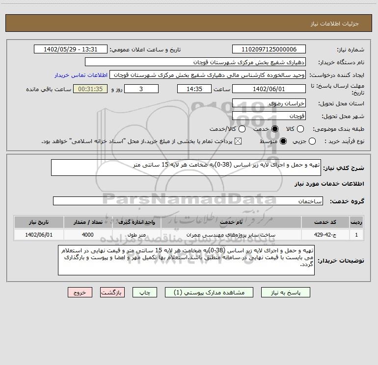 توضیحات خریدار:تهیه و حمل و اجرای لایه زیر اساس (38-0)به ضخامت هر لایه 15 سانتی متر و قیمت نهایی در استعلام می بایست با قیمت نهایی در سامانه منطبق باشد.استعلام بها تکمیل مهر و امضا و پیوست و بارگذاری گردد.