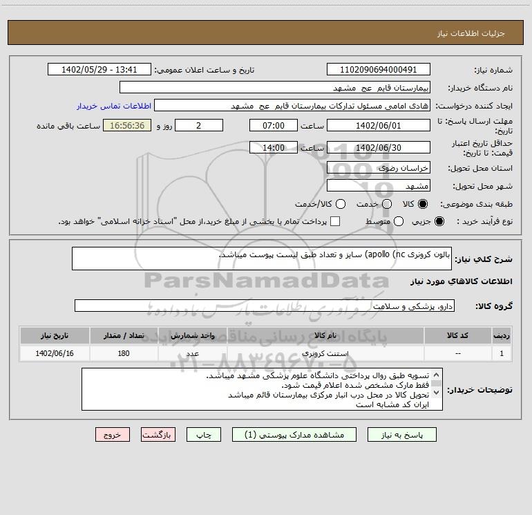 استعلام بالون کرونری apollo (nc) سایز و تعداد طبق لیست پیوست میباشد., استعلام بالون کرونری apollo (nc) سایز و تعداد طبق لیست پیوست میباشد.