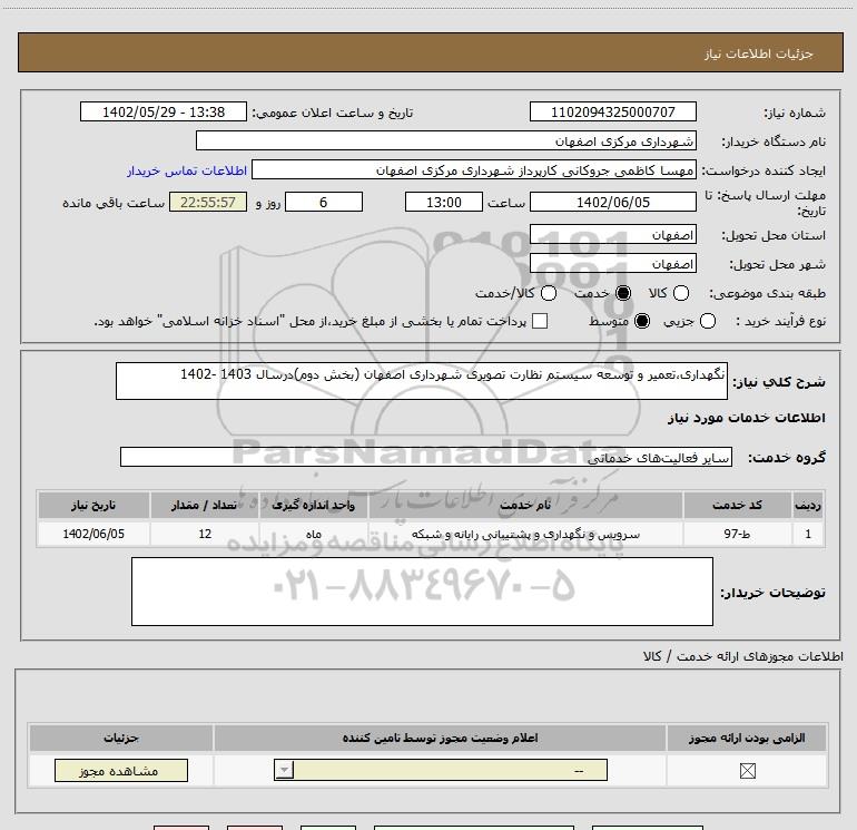 شرح کلی نیاز: نگهداری،تعمیر و توسعه سیستم نظارت تصویری شهرداری اصفهان (بخش دوم)درسال 1403 -1402