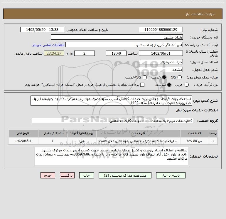شرح کلی نیاز: استعلام بهای قرارداد حجمی ارایه خدمات کاهش آسیب سوء مصرف مواد زندان مرکزی مشهد چهارماه (ازاول شهریورماه لغایت پایان آذرماه) سال 1402