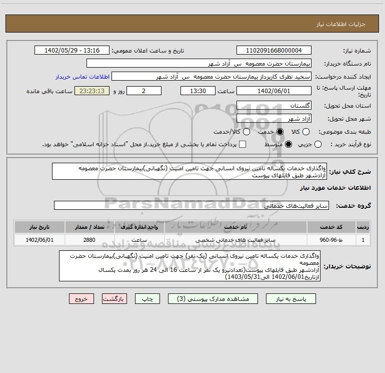 شرح کلی نیاز: واگذاری خدمات یکساله تامین نیروی انسانی جهت تامین امنیت (نگهبانی)بیمارستان حضرت معصومه آزادشهر طبق فایلهای پیوست