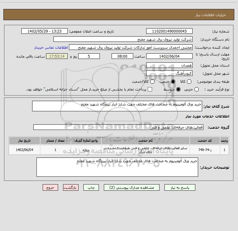 شرح کلی نیاز: خرید ورق آلومینیوم به ضخامت های مختلف جهت شارژ انبار نیروگاه شهید مفتح
