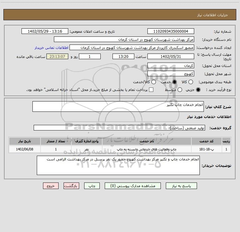 توضیحات خریدار:انجام خدمات چاپ و تکثیر مرکز بهداشت کهنوج حضور یک نفر پرسنل در مرکز بهداشت الزامی است