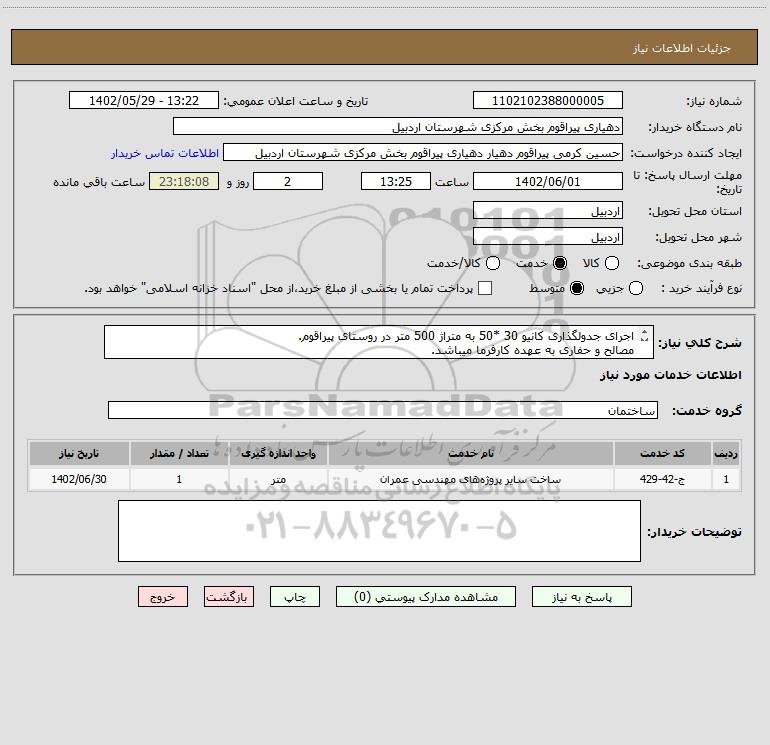 شرح کلی نیاز: اجرای جدولگذاری کانیو 30 *50 به متراژ 500 متر در روستای پیراقوم. مصالح و حفاری به عهده کارفرما میباشد. پرداخت دستمزد بعد از اتمام کار.