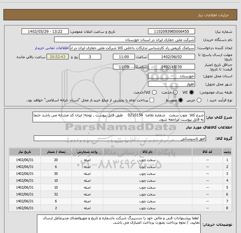 شرح کلی نیاز: شرح کالا چوب سخت شماره تقاضا 0210154 طبق فایل پیوست . توجه: ایران کد مشابه می باشد حتما به فایل پیوست مراجعه شود.