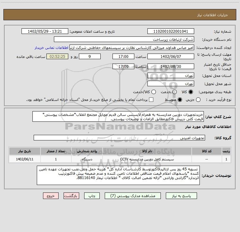 شرح کلی نیاز: خریدتجهیزات دوربین مداربسته به همراه لایسنس سالن قدیم موبایل مجتمع انقلاب*مشخصات پیوستی* قیمت کلی درپیش فاکتورمطابق الزامات و توضیحات پیوستی.