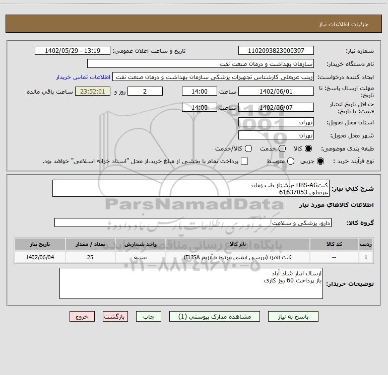 شرح کلی نیاز: کیتHBS-AG -پیشتاز طب زمان عربعلی 61637053